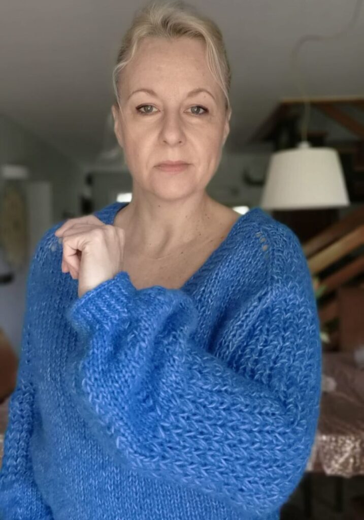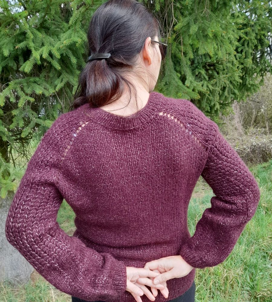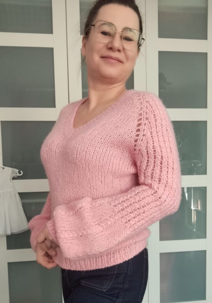 Wzór jest bardzo dobrze i zrozumiale napisany; prowadzi za rękę oczko za oczkiem. Sweter jest piękny, a ogromnego uroku dodają mu balonikowate rękawy