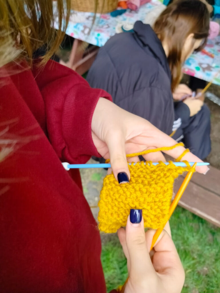 Dziergane były szydełkowe chusty, szaliczki, koszyki, a także piękne podstawki. W kąciku drucianym pojawiały się chętne osoby do nauki na drutach. Wiele z nich okazało się bardzo zdolnymi i szybko nauczyło się przerabiania oczek prawych, a nawet lewych. Niektórzy zaczynali też pracę ściegiem francuskim. W trakcie spotkania nadeszła ulewa, lecz mimo tego dalej dziergaliśmy przenosząc się do sali Goleniowskiego Domu Kultury. Przyjemnie było patrzeć na entuzjazm młodych dziewiarek i ich zapał do nauki.